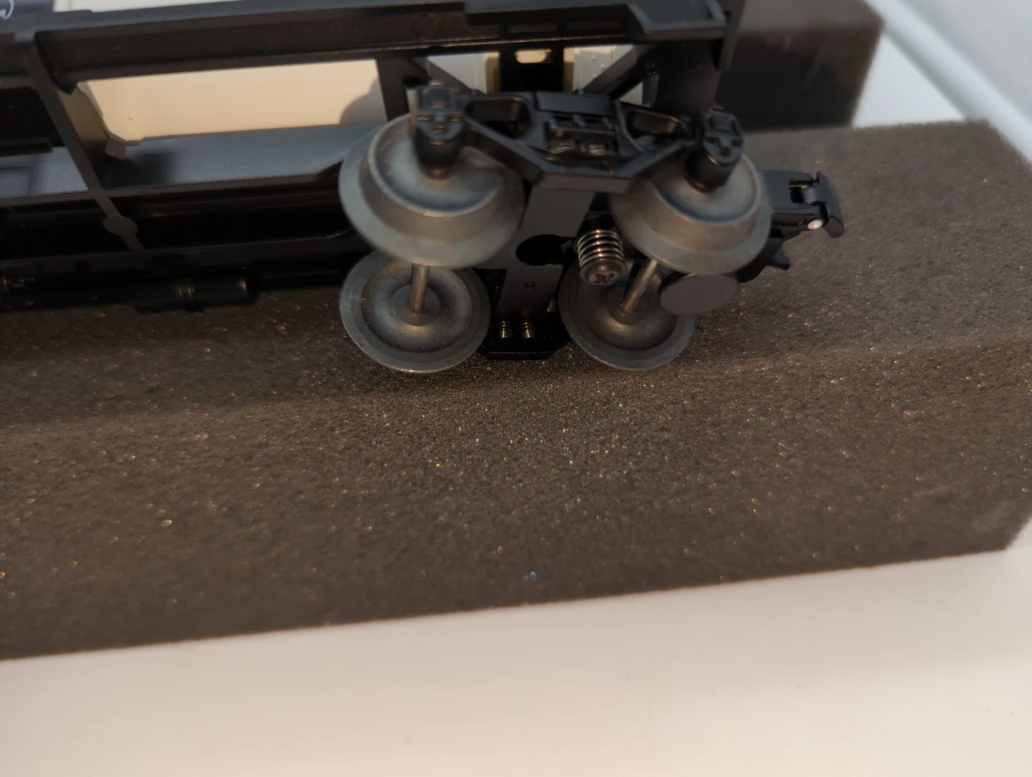 - Diecast metal sprung trucks and operating couplers