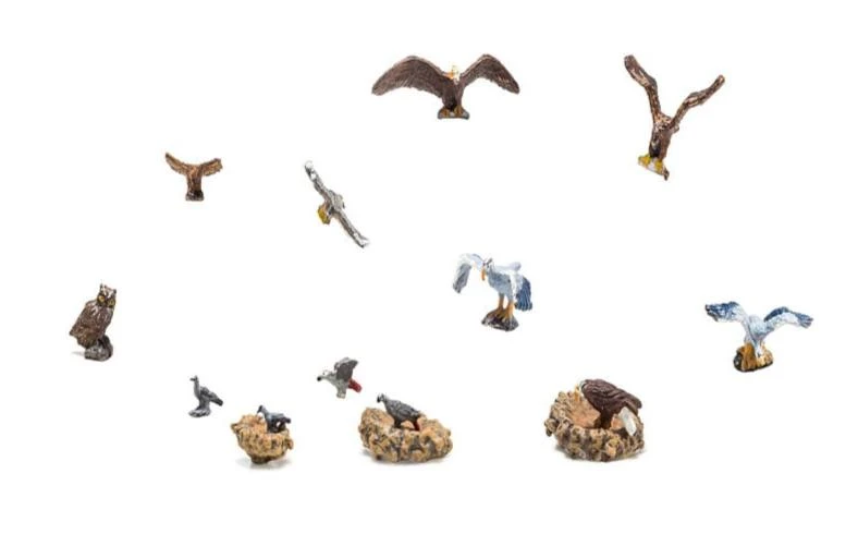 In addition to birds of prey such as bald eagles, golden eagles, buzzards and owls, the set also includes storks, ravens and pigeons. The 15-piece set also includes 3 nests for the eagles and the storks.