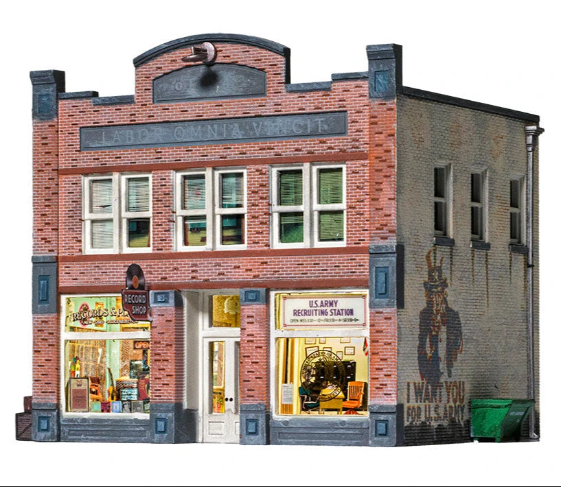 Whether you seek vinyl or valor, this O scale Built-&-Ready building is the place for you. The structure features eye-catching printed interiors of a record shop, an Army recruiting office and cozy apartments upstairs. Blinds cover the windows above the bustling businesses. It is hand-painted and authentically weathered. There are also exterior details like crates and barrels, as well as decals and signage.